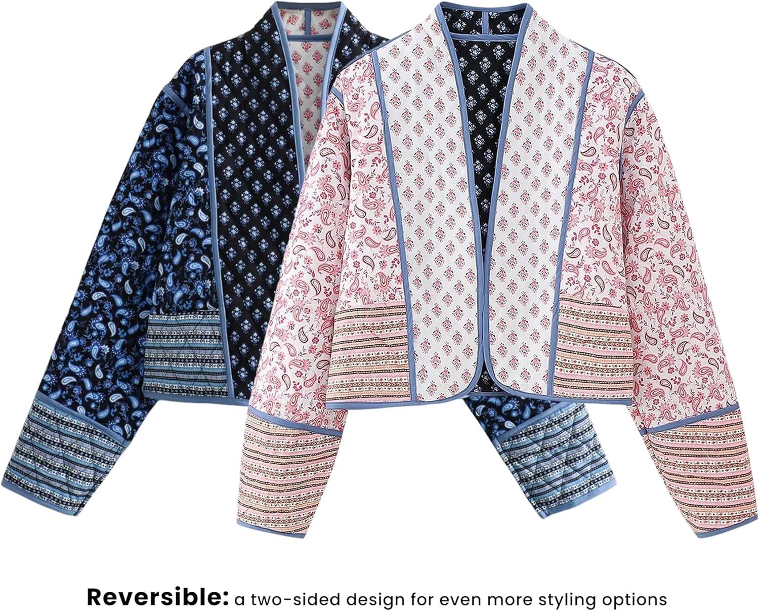 imageOmoone Womens Cropped Floral Reversible Quilted Jacket Cardigan Printed Lightweight Open Front Padded Puffer CoatBrown