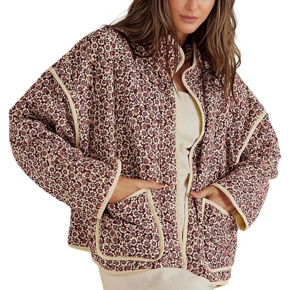 imageOmoone Womens Cropped Quilted Jacket Floral Printed LightWeight Padded Puffer Cardigan Coat OutwearRed