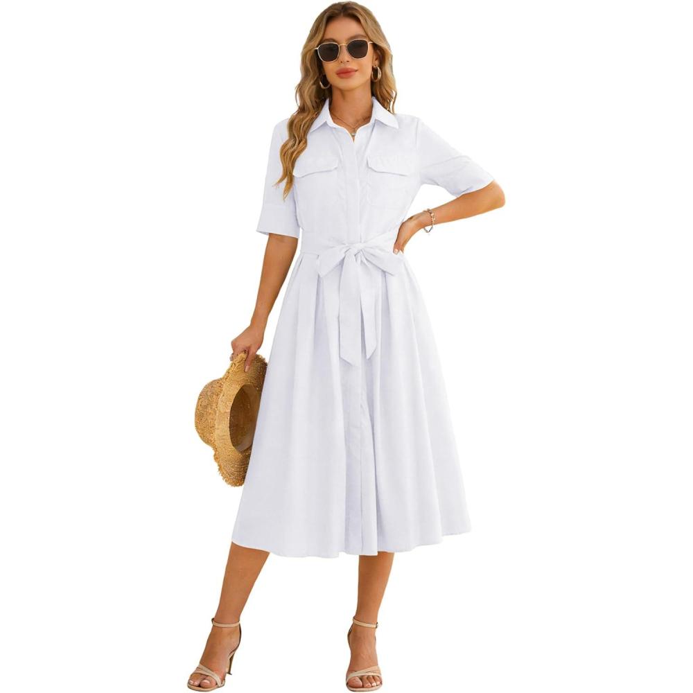Omoone Womens Summer Button Down Shirt Dress 2026 Casual Short Sleeve Tie Waist Boho Midi Maxi Dresses(White)